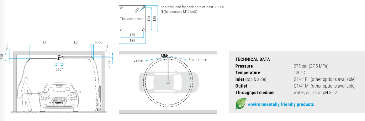 Double washing arm that allows you to offer more services on the same track with flexible internal rubber tubing