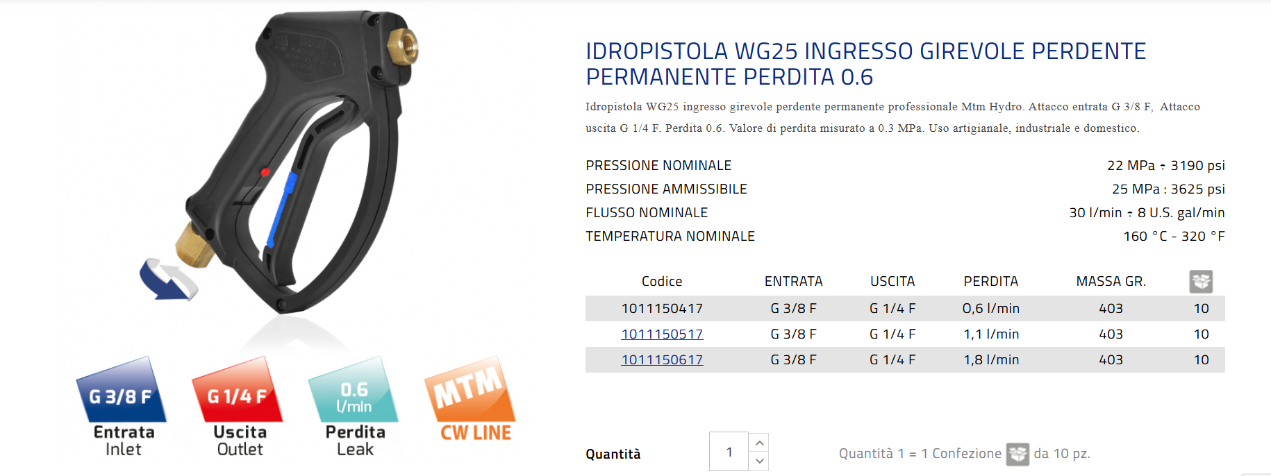 Mtm Hydro professional permanent leakage swivel entry water gun WG25. Inlet connection G 3/8 F, Outlet connection G 1/4 F. Leakage 0.6. Leakage value measured at 0.3 MPa. Artisan, industrial and domestic use.
