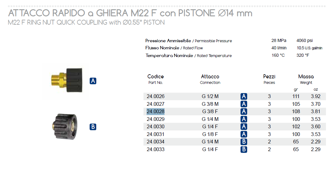 Quick connection with handwheel M22 Female - 3/8 Female. Brass / nickel-plated iron material
