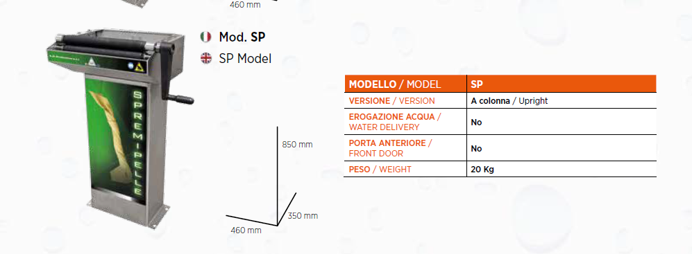 Designed to rinse and wring the skins used to dry the vehicle body. Even if it is a simple machine, all the components have been studied, designed and finally realized by AD Produzione (eg the rubber rollers, the bushings, the stainless steel handwheel).