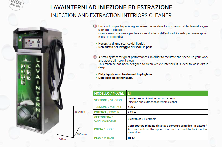 Interiors with injection and extraction. Automatic loading and unloading. A small plant for a great yield, to make your work easier and faster, but above all cleaner! This machine is designed to wash the car's interior seats and is ideal for washing deep dirt.