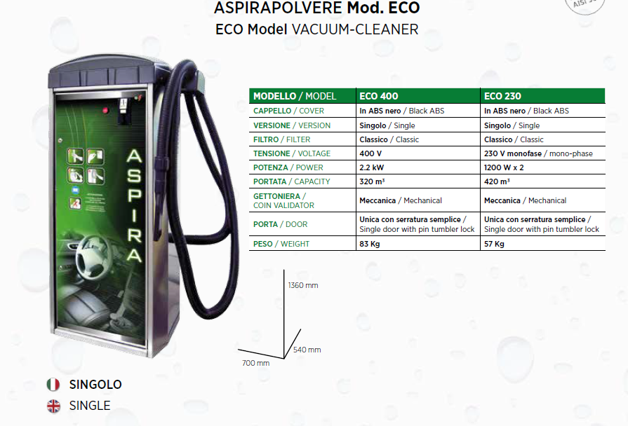 Economic 220V aspirator mechanical coin acceptor with single vacuum cleaner Mod. ECO. Classic filter features.