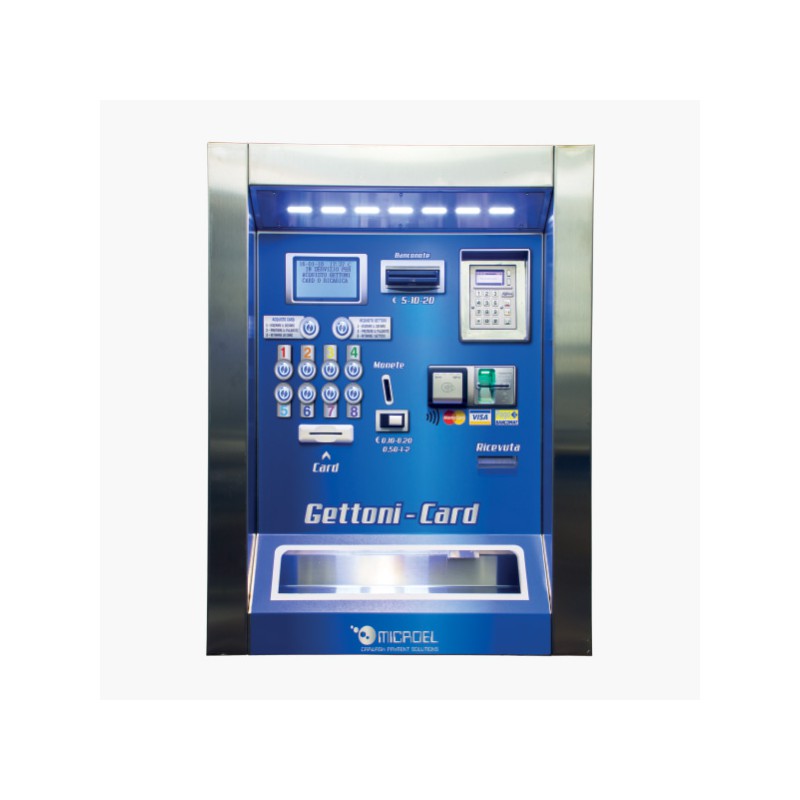 banknote reader, coin acceptor with separator, 1 token dispenser (550Pz capacity), card reader/recharge system.