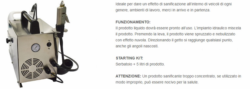 Ideale per dare un effetto di sanificazione all'interno dei veicoli di ogni genere, ambienti di lavoro, merci in arrivo e in partenza.