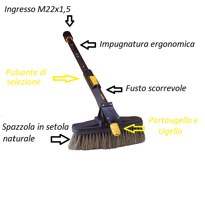 Lancia Karcher a doppio uso Lancia HP/spazzola. Basta far scorrere il fusto per passare dall’utilizzo della lancia alta pressione all’utilizzo della spazzola perpendicolare.