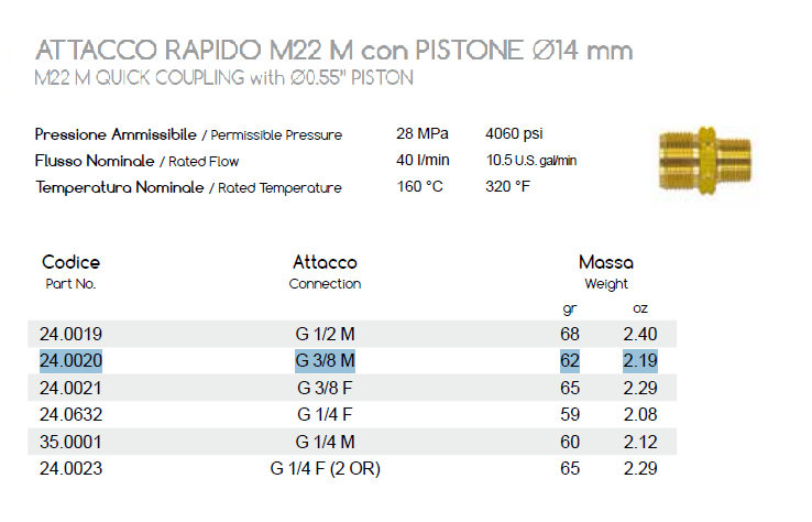 Nipplo ad innesto rapido M22 M con pistone diametro 14 mm