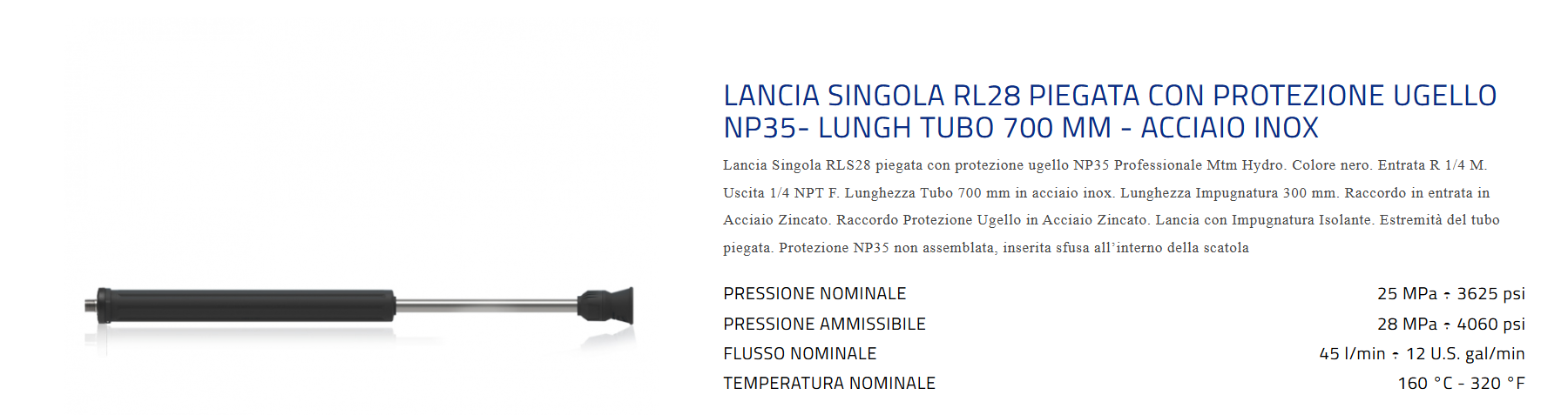 Lancia Singola RLS28 inclinata con protezione ugello NP35 Professionale Mtm Hydro. Colore nero. Entrata R 1/4 M. Uscita 1/4 NPT F. Lunghezza Tubo 700 mm in acciaio inox. Lunghezza Impugnatura 300 mm. Raccordo in entrata in Acciaio Zincato.