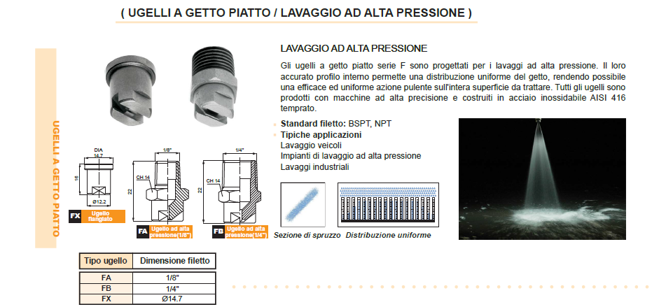 accurato profilo interno permette una distribuzione uniforme del getto, rendendo possibile una efficace ed uniforme azione pulente sull'intera superficie da trattare. Tutti gli ugelli sono prodotti con macchine ad alta precisione e costruiti in acciaio inossidabile AISI 416 temperato.