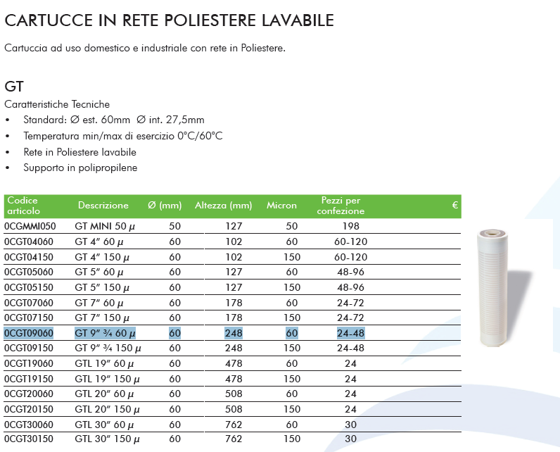 Cartuccia ad uso domestico e industriale con rete in Poliestere.