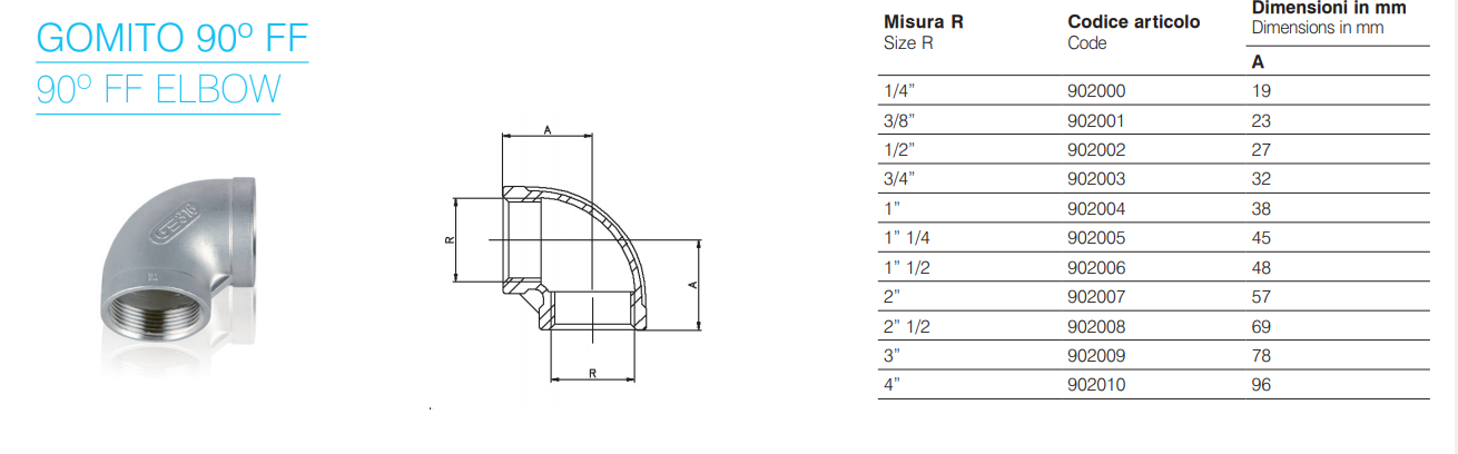 Curva a gomito 90° 1/4“ Femmina-Femmina
