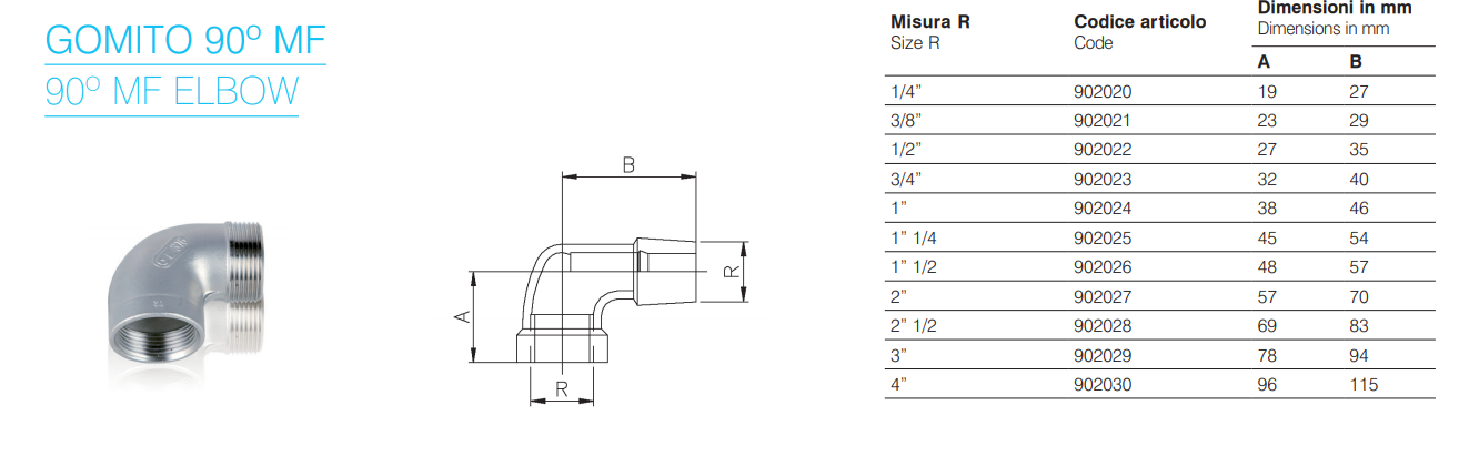 Raccordo idraulico in acciaio Inox, curva a gomito 90° 1/4“ Maschio-Femmina