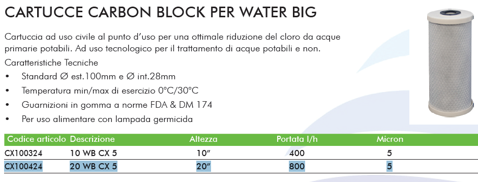 Cartuccia ad uso civile al punto d’uso per una ottimale riduzione del cloro da acque primarie potabili. Ad uso tecnologico per il trattamento di acque potabili e non.