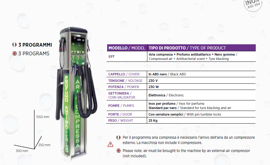 N.B. Per il programma aria compressa è necessario l’arrivo dell’aria da un compressore esterno. La macchina non include il compressore.