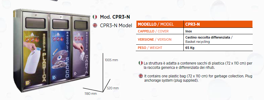 Cestino porta rifiuti per la raccolta differenziata di carta, plastica, secco (indifferenziato). La struttura alloggia al suo interno sacchi classici in plastica (72 x 110 cm) per la raccolta generica e differenziata dei rifiuti. Fissaggio a terra con tasselli (tasselli in dotazione).