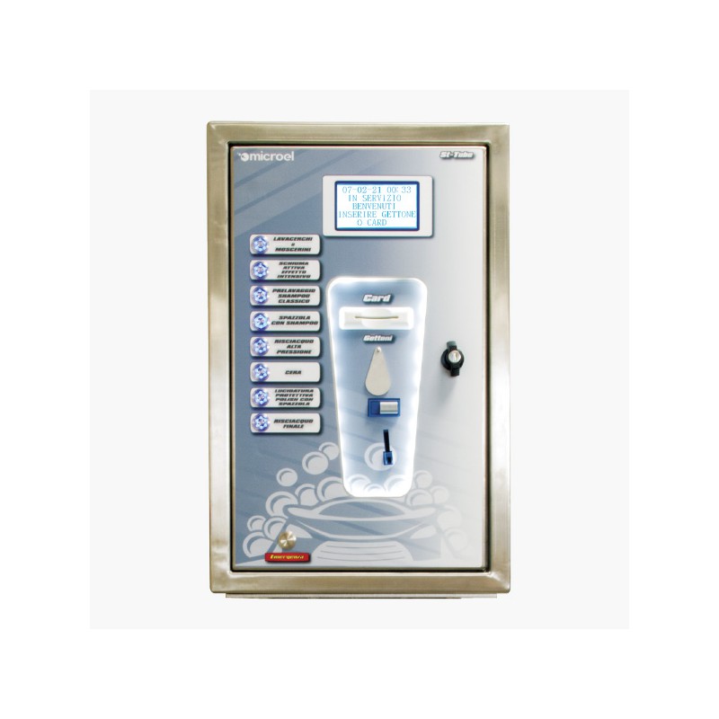 Pulsantiera attivatore per box self service equipaggiata di Midi Smart, la scheda elettronica interamente progettata e realizzata dalla nostra azienda, gestisce fino ad 8 programmi di lavaggio con durata e costi indipendenti per ogni programma.